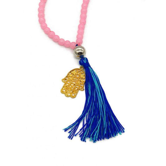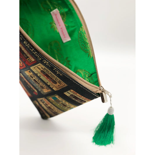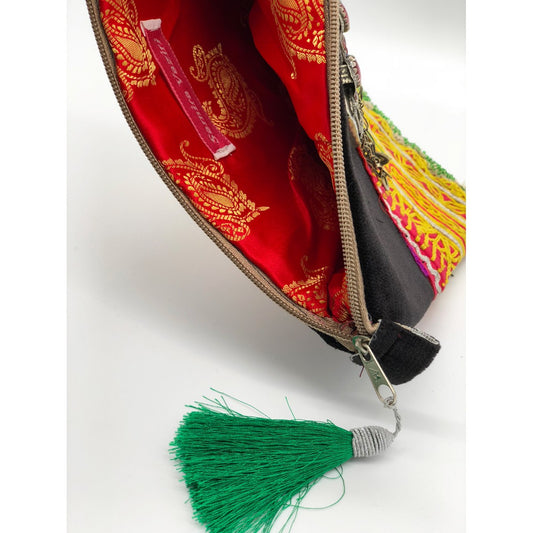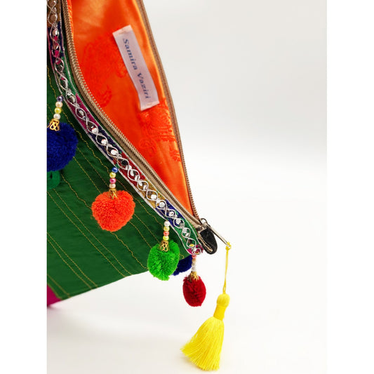 Green And Pink Tribal Clutch With Pompoms And Yellow Tassel